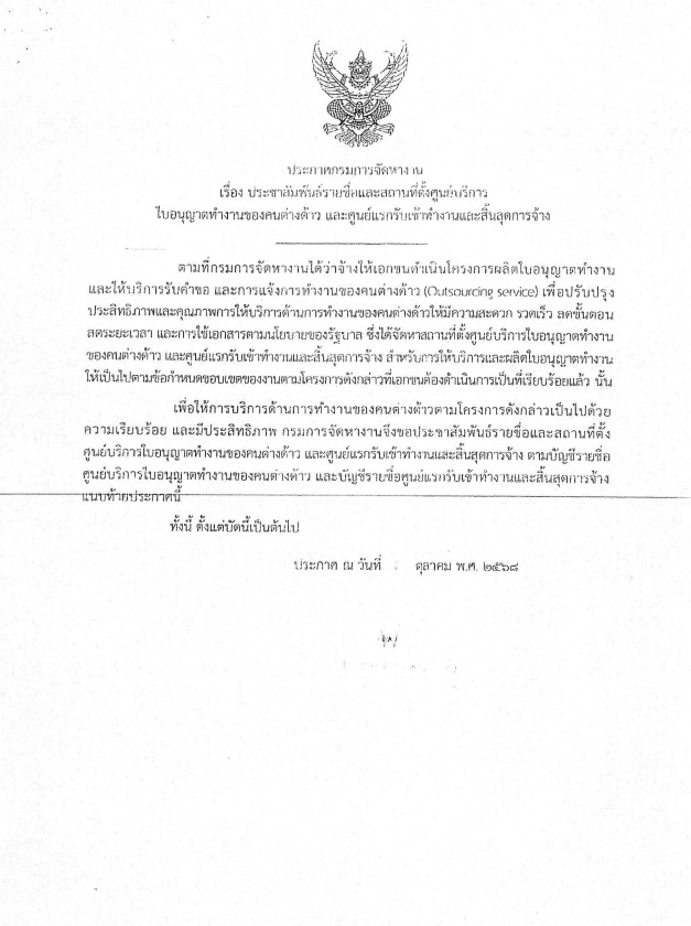 แจ้งประกาศกรมการจัดหางาน เพื่อรองรับการเปิดให้บริการขออนุญาตทำงานและการแจ้งการทำงานของต่างด้าวในรูปแบบอิเล้กทรอนิกส์