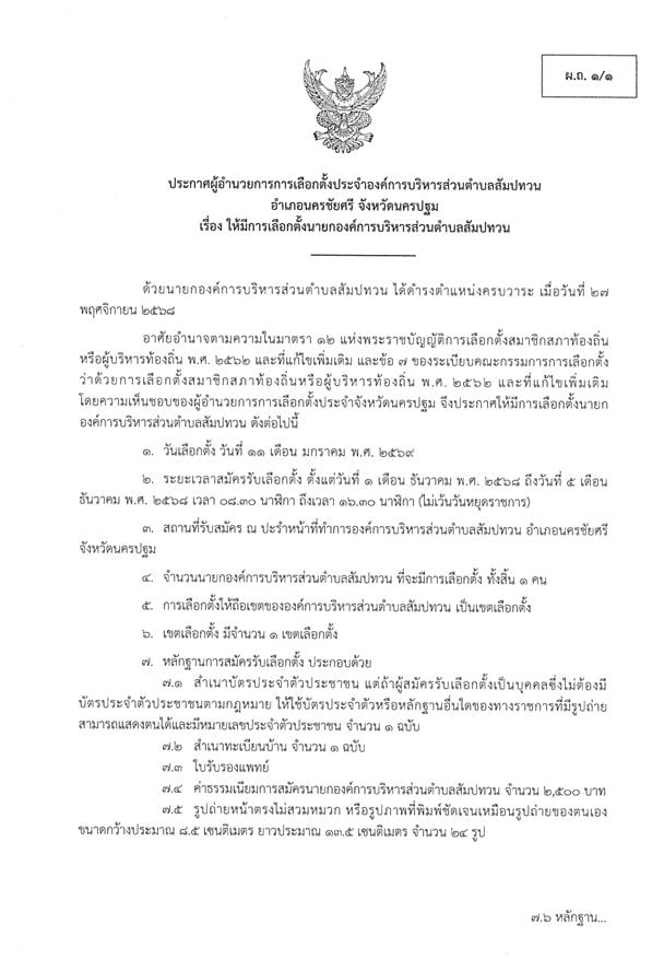 ประกาศผู้อำนวยการการเลือกตั้งประจำองค์การบริหารส่วนตำบลสัมปทวน อำเภอนครชัยศรี จังหวัดนครปฐม เรื่อง ให้มีการเลือกตั้งนายกองค์การบริหารส่วนตำบลสัมปทวน
