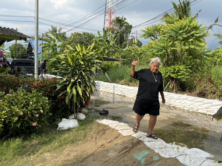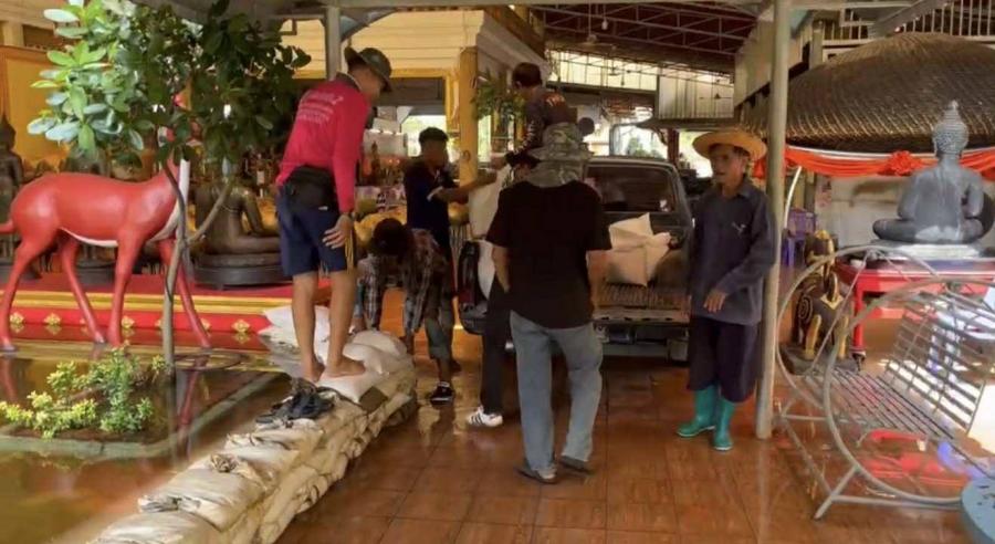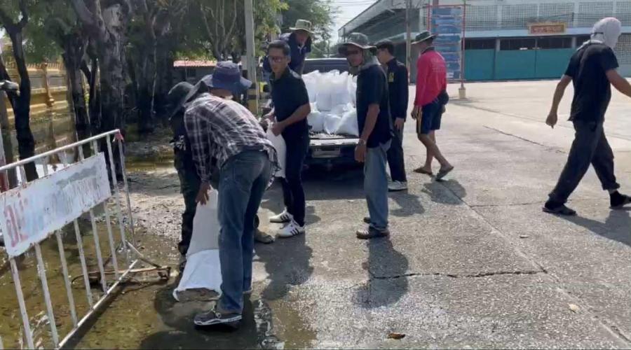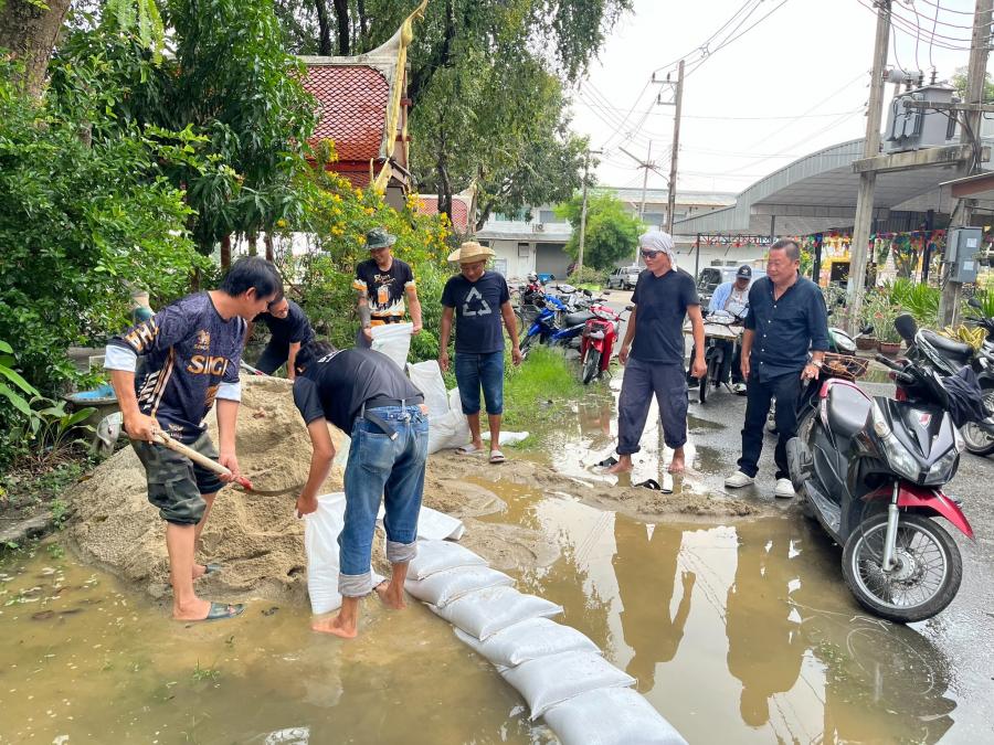 เสริมแนวกระสอบทราย ทำเป็นคันกั้นน้ำ เพื่อป้องกันน้ำท่วม บริเวณ วัดกลางคูเวียง ,วัดสัมปตาก และ ม.4