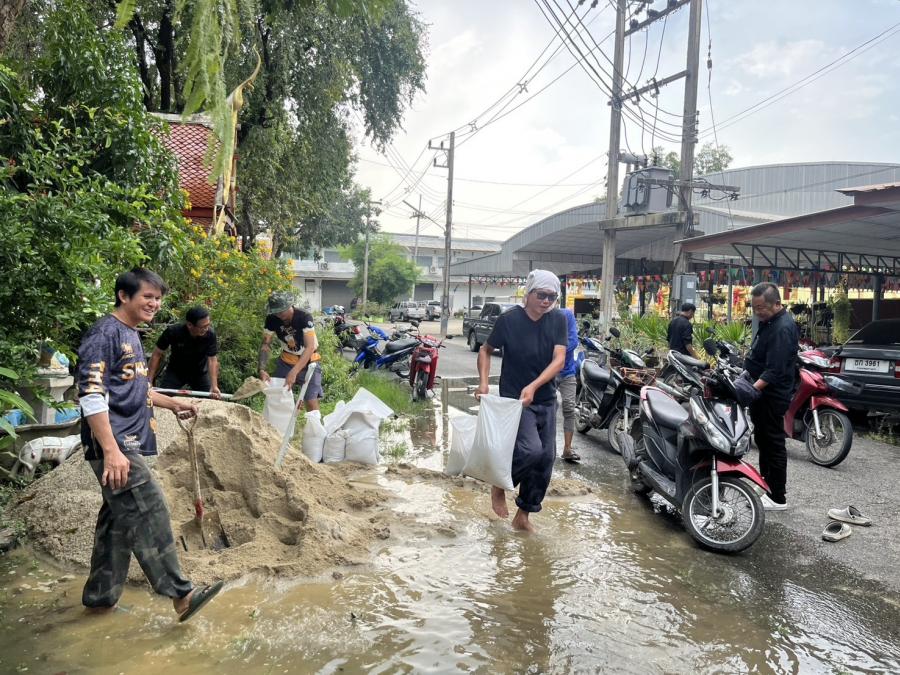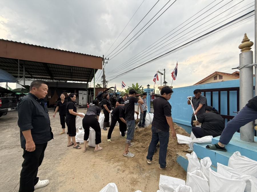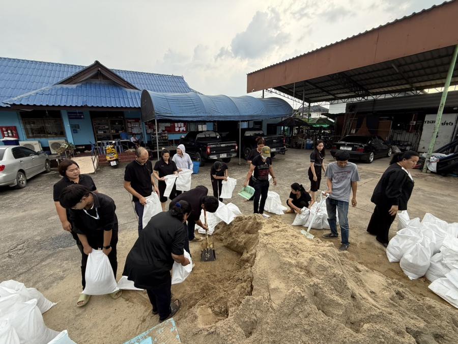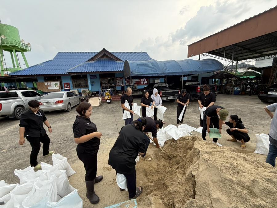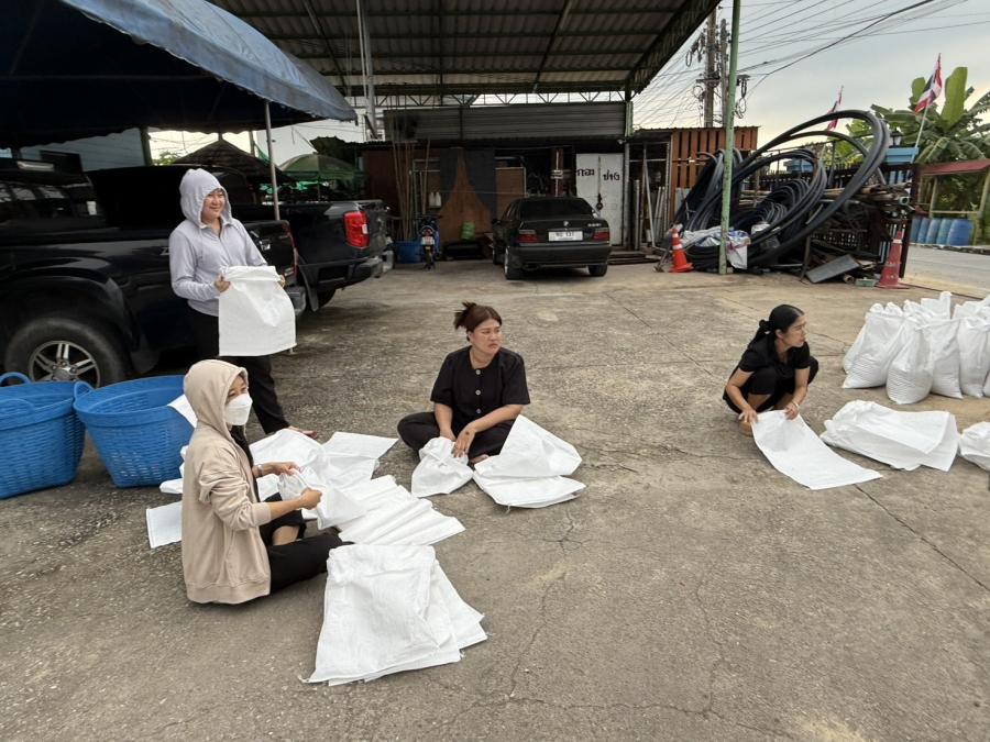 ร่วมกันกรอกทราย เพื่อใส่กระสอบทรายทำเป็นแนวคันกั้นน้ำเพื่อป้องกันน้ำท่วม บริเวณ ต.สัมปทวน
