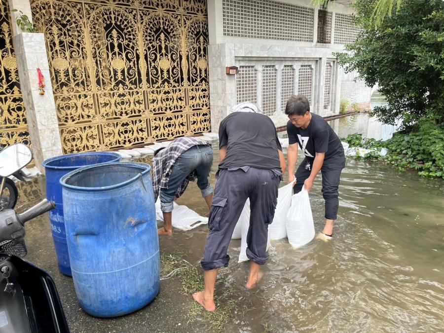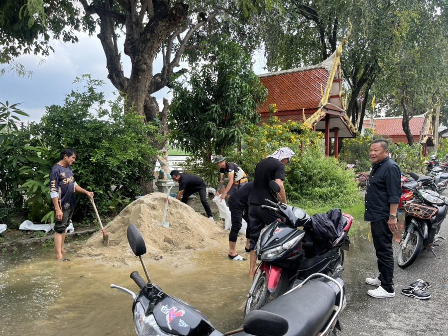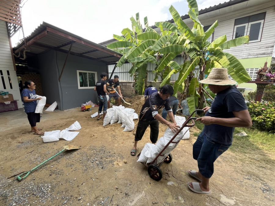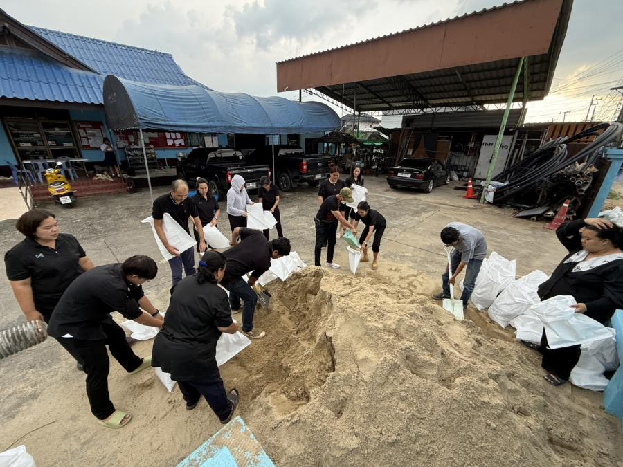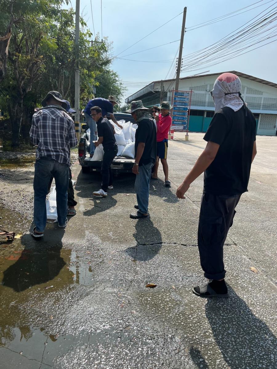 ร่วมกันกรอกทราย เพื่อใส่กระสอบทรายทำเป็นแนวคันกั้นน้ำเพื่อป้องกันน้ำท่วม บริเวณ ต.สัมปทวน