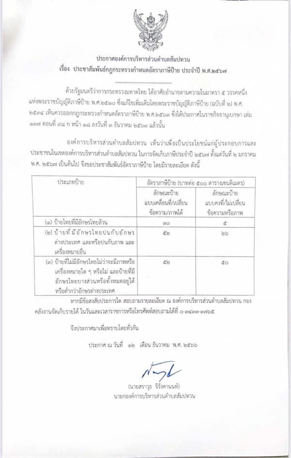 ประชาสัมพันธ์กฎกระทรวงกำหนดอัตราภาษีป้าย ประจำปี พ.ศ.2567