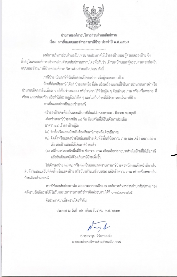 การยื่นแบบและชำระค่าภาษีป้าย ประจำปี พ.ศ.2567