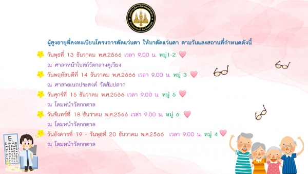 แจ้งวัน และสถานที่ ผู้สูงอายุที่ลงทะเบียนโครงการตัดแว่นตา