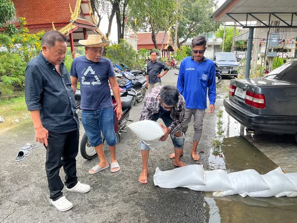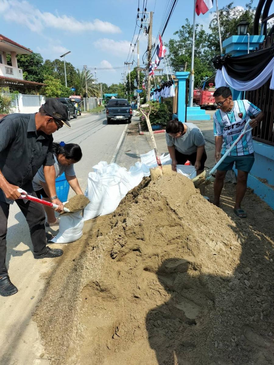 ร่วมกันกรอกทราย / เสริมแนวกระสอบทราย / ตรวจเฝ้าระวังระดับน้ำ